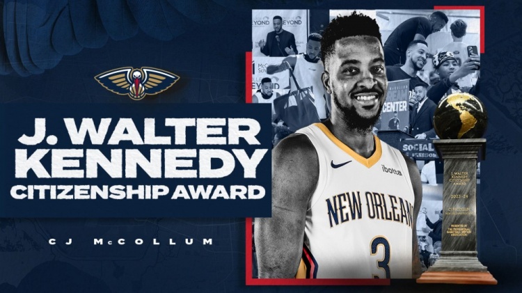 官方:鹈鹕球星CJ麦科勒姆获得本年度肯尼迪公民奖!