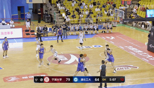 而有了稳定中距离做支撑,王凡懿在罚球线附近的游走变得非常有威胁——由于宁波大学常打三后卫,锋线的王凡懿实际站到了四号位的位置(这也是为什么一些数据平台会认为王凡懿是大前锋),于是他就需要扮演一个空间点,并且肩负一些策应任务。