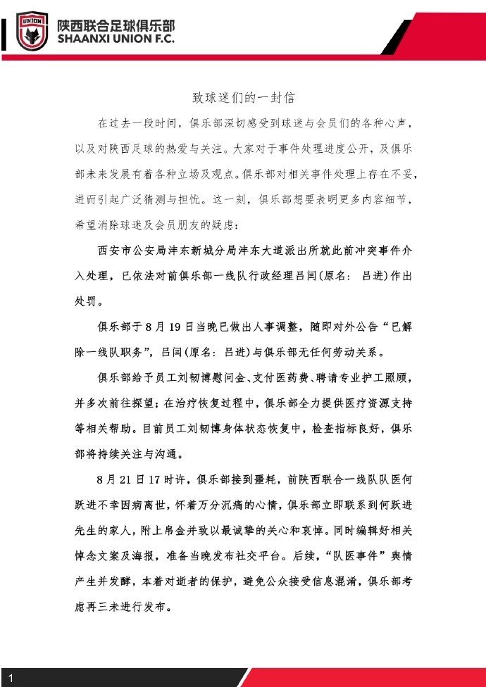 陕西联合官方今天发布声明,西安市公安局沣东新城分局沣东大道派出所已依法对前俱乐部一线队行政经理吕闫作出处罚。同时,俱乐部予以员工刘韧博慰问金、支付医药费、聘请专业护工照顾,并全力提供医疗资源支持。