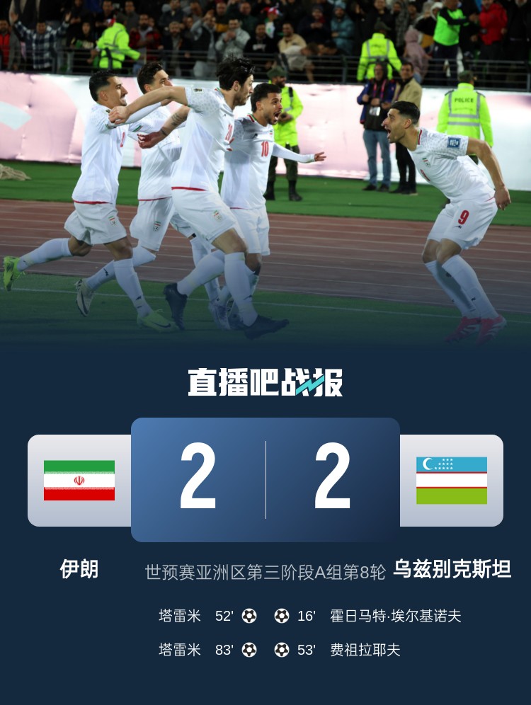 伊朗2-2战平乌兹别克斯坦,伊朗提前锁定直通世界杯!本场塔雷米双响。