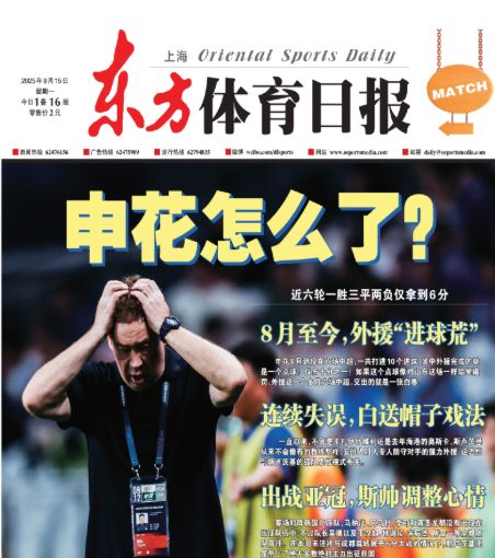 雷速体育9月15日宣 据今日《东方体育日报》报道,上海申花近六轮一胜三平两负仅拿到6分,媒体通过头版发布《申花怎么了》,并配上主帅斯卢茨基抱头无奈的图片。