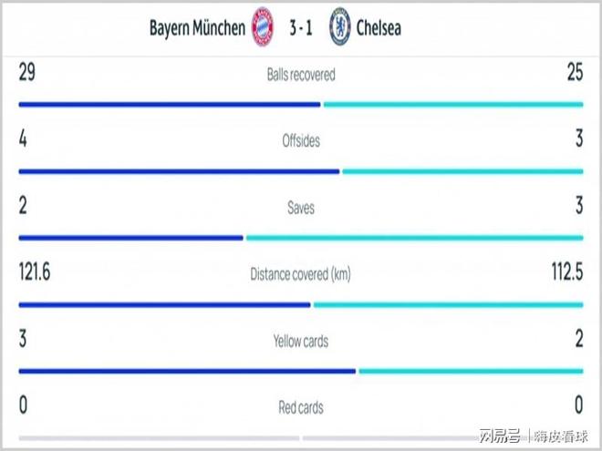 从统计数据来看,在跑动距离中,切尔西全队只有112.5公里,比拜仁的121.6公里,差不多少了10公里,几乎可以算是“少踢一人”。在欧冠这样高水平的比赛中,少一人等于缴械投降,所以切尔西的落败,也有自身的原因。