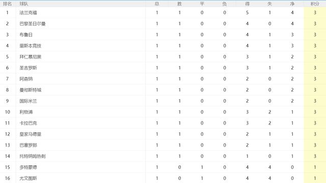 值得一提的是,尽管8支强队表现出色,但是首轮过后,排名第一的却是法兰克福队。在这个比赛日,法兰克福在主场5-1大胜加拉塔萨雷,他们也以进球的优势,力压大巴黎,在欧冠积分榜登顶。除了法兰克福之外,排名前八的还有布鲁日和圣吉罗斯2大黑马。跟上赛季一样,欧冠前八的竞争非常激烈,相信届时会有一些豪门,会被挤到附加赛,而像法兰克福这样的黑马,也有希望直接晋级淘汰赛!