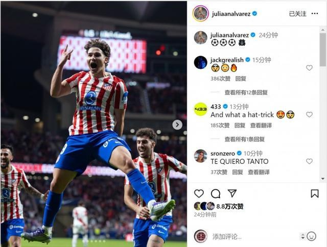 阿尔瓦雷斯社媒晒出比赛照片,庆祝球队取胜+戴帽,配文:⚽️⚽️⚽️️