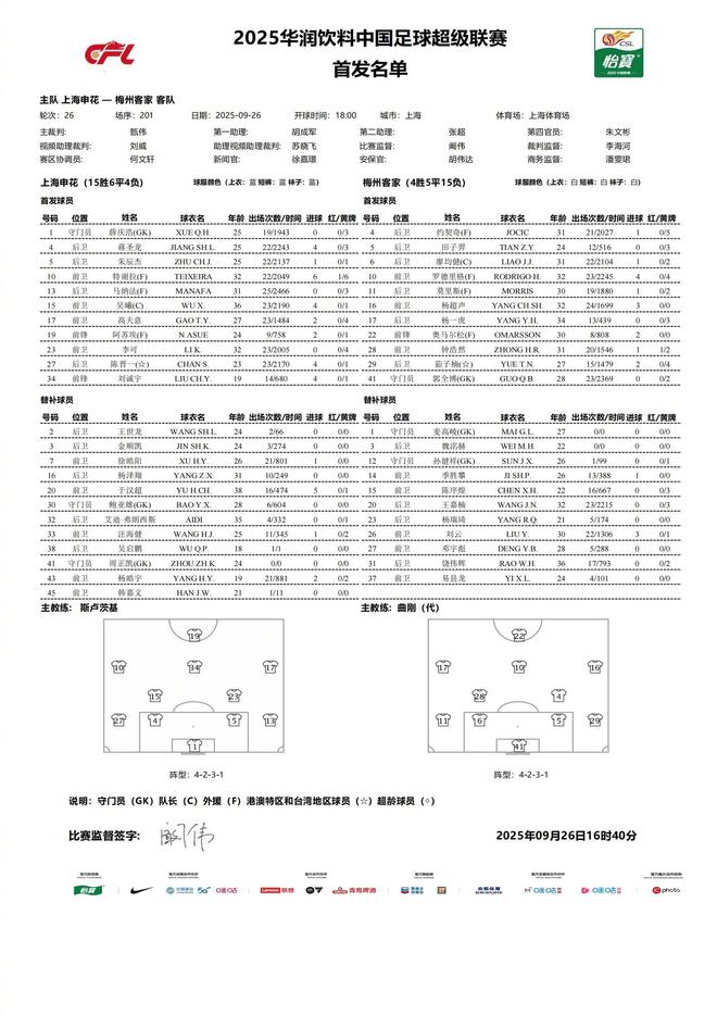 雷速体育9月26日宣 中超第26轮,上海申花主场迎战梅州客家。赛前,双方公布首发名单。