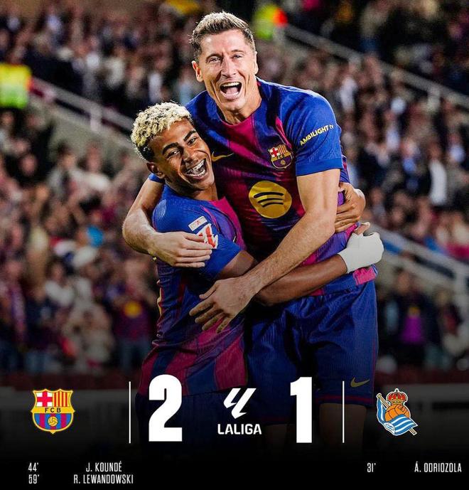 北京时间9月29日凌晨,西甲第7轮,巴萨坐镇主场迎来劲旅皇家社会的挑战。就在不久前,皇马在马德里德比中惨遭马竞5-2屠杀,让积分榜的领头羊之位出现了微妙的松动。红蓝军团开局6轮5胜1平的不败战绩,已经让他们死死咬住皇马。此役弗里克的球队只要在诺坎普全取3分的话,将力压死敌皇马首次登上西甲积分榜首位。最终,凭借拉什福德助攻孔德扳平,亚马尔连线莱万反超,巴萨2-1逆转对手,让西甲榜首易主。
