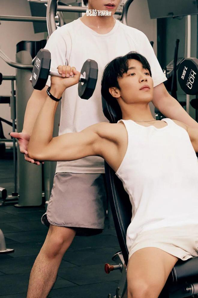 李汶翰握紧器械,手臂肌肉线条在发力时清晰紧绷,每一次推举都带着精准的控制感;周洁琼在瑜伽垫上完成拉伸,腰背舒展成流畅的弧线,指尖轻触脚尖时,柔韧度与力量感完美融合,发丝随动作轻轻晃动;吴旭则在李汶翰的保护下使用哑铃推举,感受着呼吸与自我的连接。