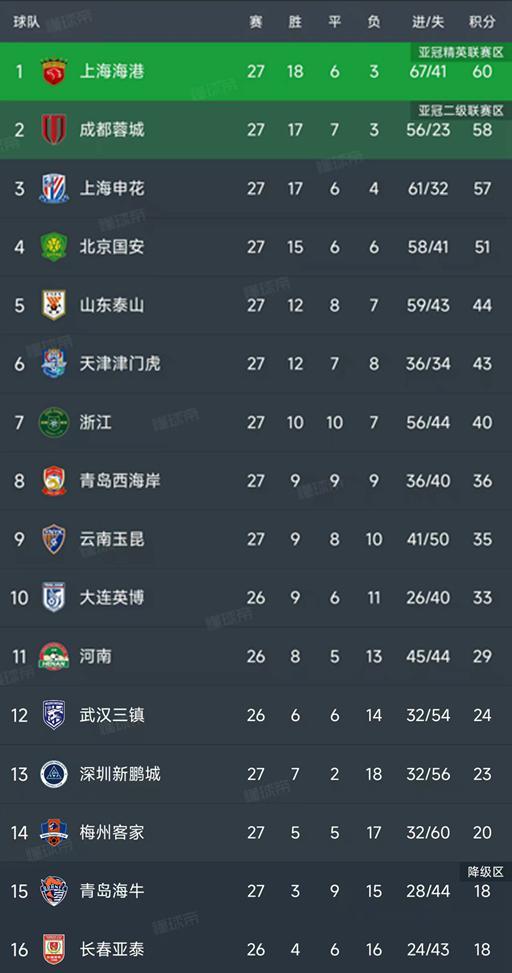 中超第27轮结束了6场比赛,最新积分榜如下!