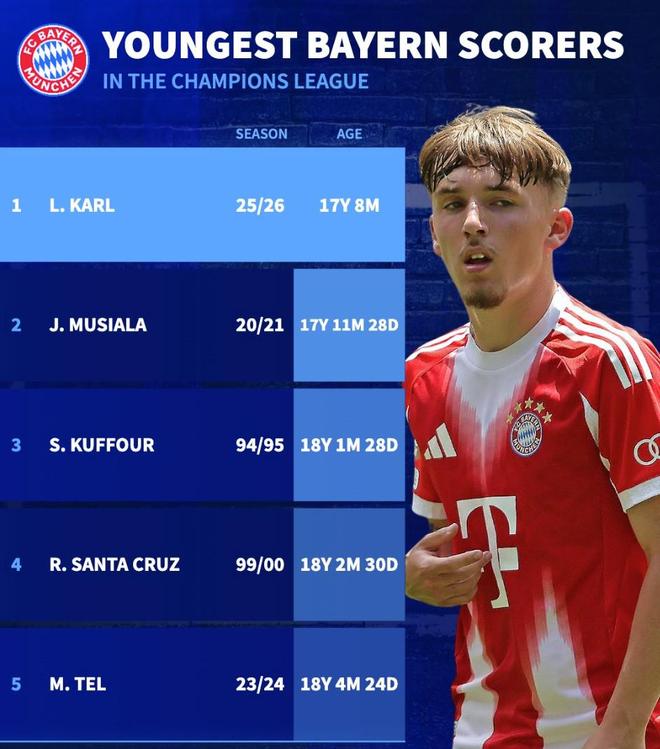 - 英超 | 拜仁欧冠最年轻进球者前5:卡尔第1,穆西亚拉第2,特尔上榜
