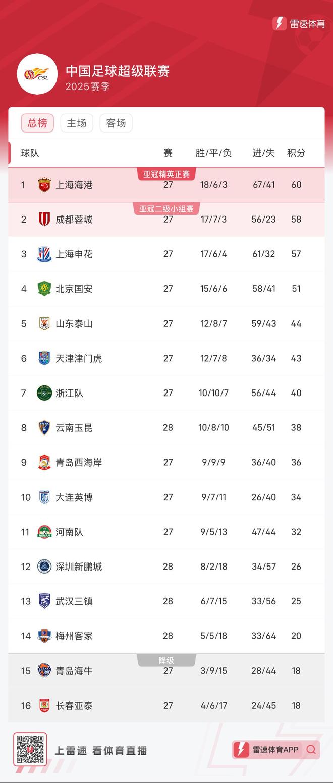 雷速体育10月24日宣 在刚刚结束的两场关乎保级的中超比赛中,深圳新鹏城2-1击败保级对手三镇,反超对手位列第12位。