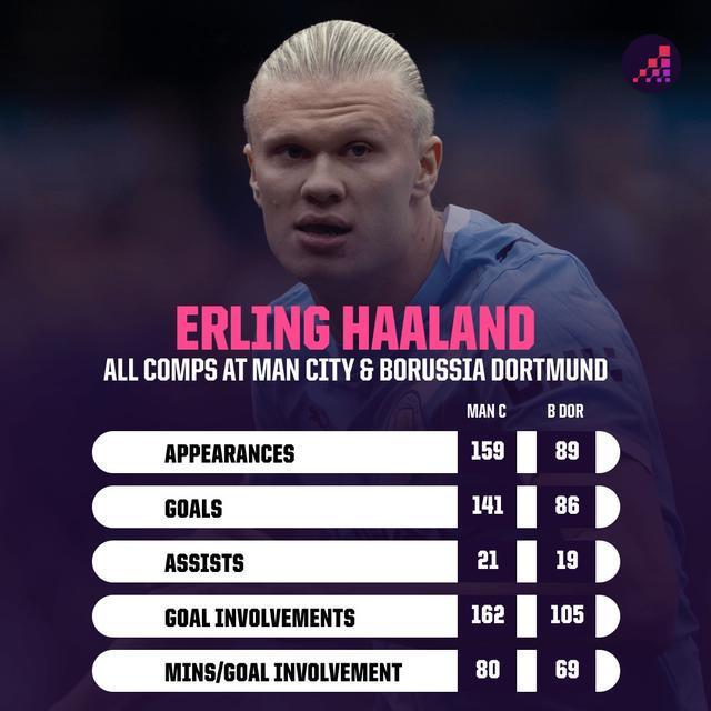 - 英超 | 高效!哈兰德曼城生涯80分钟参与一球,多特生涯69分钟造一球