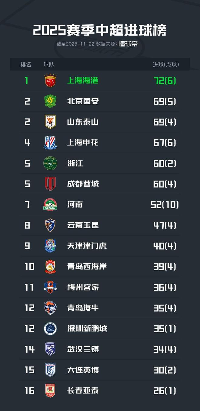本赛季中超进球榜:海港72球居首,国安、泰山69球第二