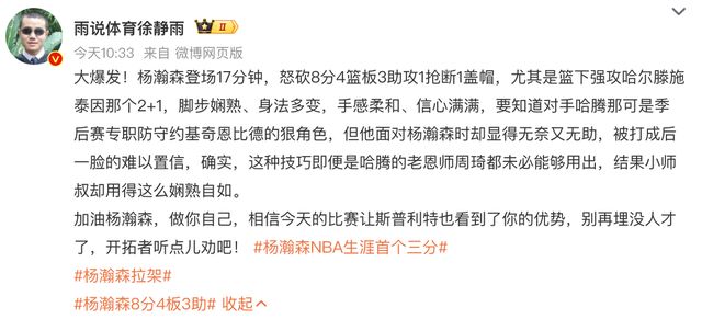 - NBA | 徐静雨:杨瀚森梦幻脚步打到哈腾无奈又无助,开拓者别再埋没人才