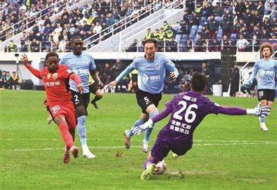 上海海港队球员加布里埃尔(左一)在比赛中射门得分。新华社记者 吴青昊摄