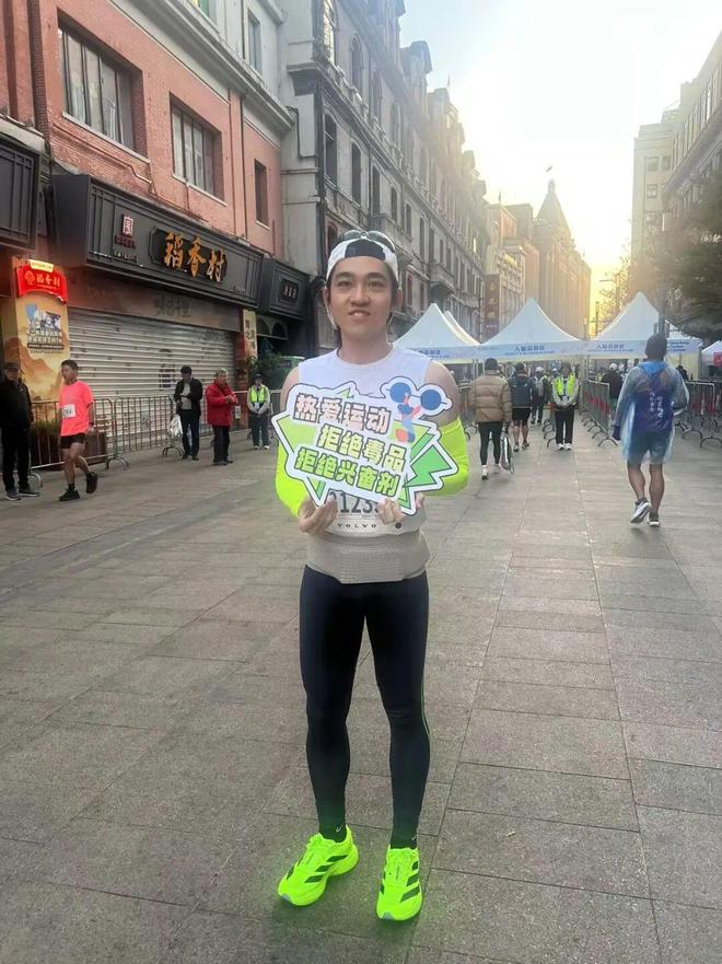 在黄浦区外滩滨江的晨光中,参赛选手手持“拒绝毒品 远离兴奋剂 拥抱美好人生” 的宣传标语牌,精神抖擞地开启征程。