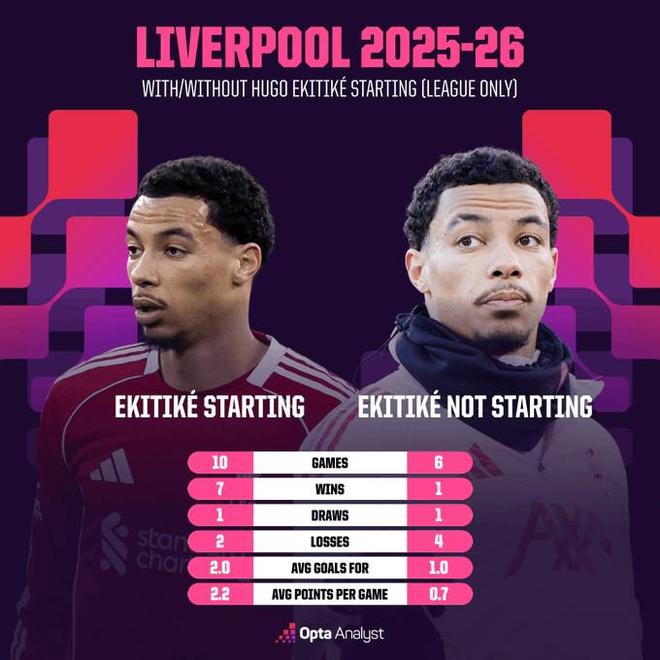 埃基蒂克本赛季英超首发时利物浦10战7胜,未首发时6战4负