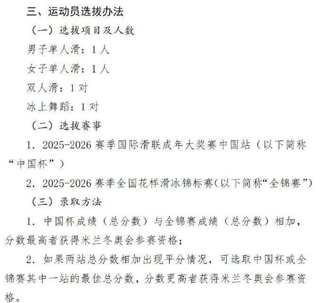 按照国家体育总局冬季运动管理中心10月公布的《花样滑冰项目米兰冬奥会参赛选拔办法》,本赛季国际滑联花样滑冰大奖赛中国杯和全国花样滑冰锦标赛两次比赛的总分将作为米兰冬奥会参赛选手的选拔依据。因此在全锦赛结束后,中国花样滑冰队出征米兰冬奥会的名单将全部产生。