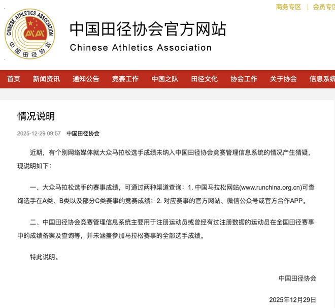 12月29日,中国田径协会发布情况说明,全文如下: