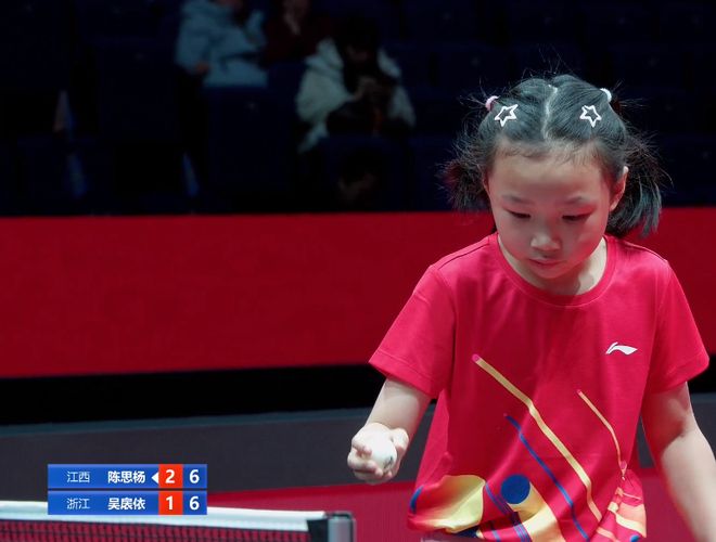 梳着两条辫子,一张萌娃脸很稚嫩,很可爱,陈思杨在赛场上却是狠辣无情,在乒超联赛总决赛期间,国少乒乓选拔赛也一并举行。陈思杨在9岁女单组和老对手吴扆依再次会师决赛,她以4比2击败对手,蝉联了国少选拔赛冠军。陈思杨在去年国少选拔赛杀进8岁组决赛,击败了吴扆依夺冠。这次,她还是击败吴扆依夺冠,统治了她这个年龄段的比赛。