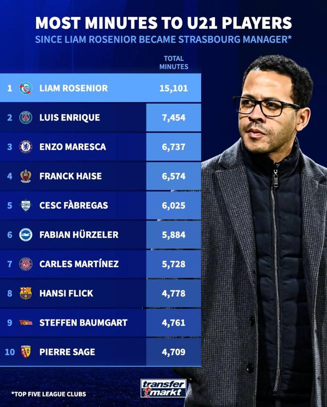 北京时间1月6日,在切尔西官宣罗塞尼尔成为球队新任主帅之后,来自德转的统计指出,自2024年7月罗塞尼尔开始执教斯特拉斯堡以来,这位现年41岁的英格兰教头是欧洲五大联赛俱乐部中给予U21球员最多出场时间的主教练。